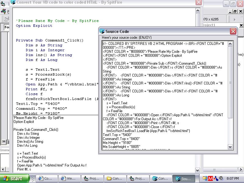 Well its been awhile since i released "Convert Your VB code to color coded HTML" on 10/13/2002, and I never actually started listening to peoples feedback untill today while i was browsing threw my 30 some submissions... Since people sayed i should add this, you can now finnally few the source code :) Please rate and enjoy ;)