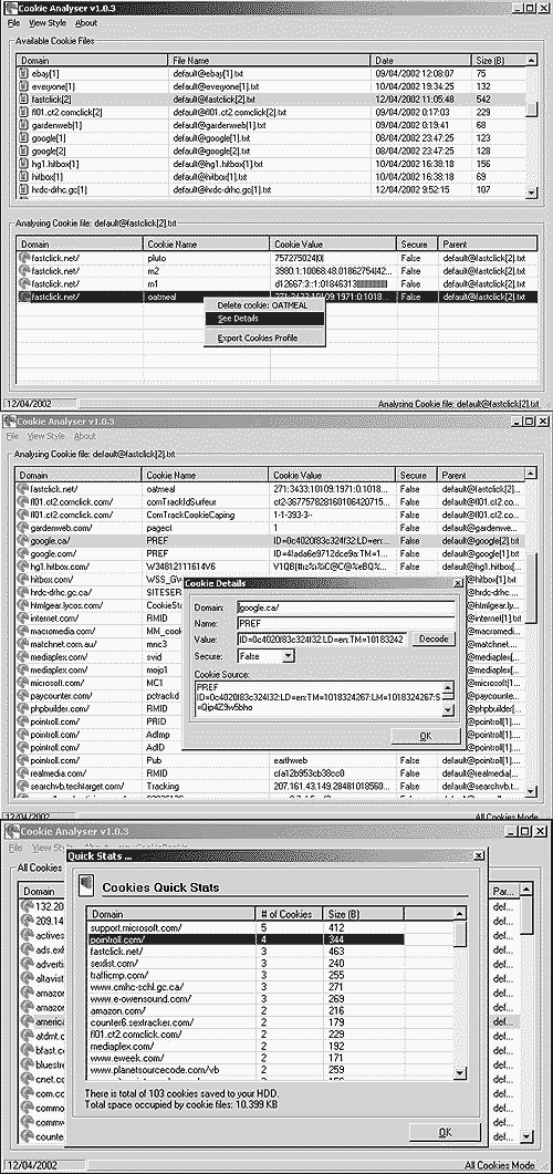 This program helps you analyze your IE cookies. It shows cookie's details allows you to delete individual cookies or cookies based on certain domain. Gives you some quick stats about cookies and helps you to monitor what exactly you are receiving. It's quite nice and actually useful.