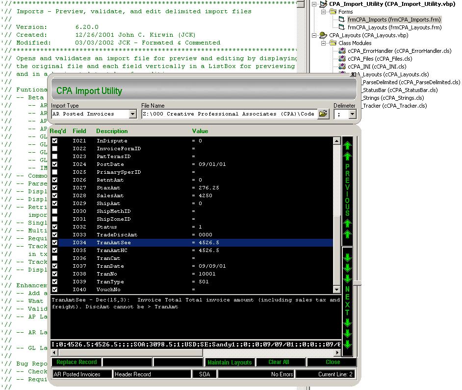 Opens and validates an import file for preview and editing by displaying the original file and each field vertically in a ListBox for previewing and in a horizontal text box for editing.