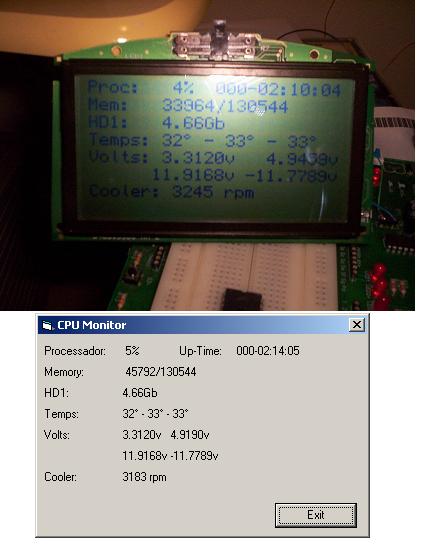 This program show in a HG12603 LCD (via serial) Processor usage, up-time, memory usage, free disk space, temperatures of processor, voltage, and cooler rpm. The circuit to make this CPU Monitor is in inside the zip file. This program run in a Intel MotherBoard with PIII. Part of code I find in VBC TKS!!!!