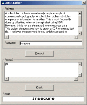 I see simple XOR encryptions being posted on VBC very often. Many people don't know, but XOR is far from secure. Since the password is repeated many times in the encrypted message, it is easy to find out what password was used. This project demonstrates how to get the password from an encrypted message. It works on most encrypted messages, as long as the ciphertext is long enough. Please keep in mind that this project is ment as a demonstration, and not a full-blown cracker app. However, it can be used to crack many files and applications...