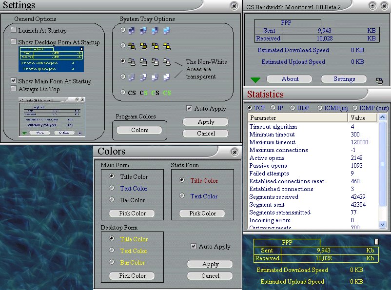 This program has code from antoher tool I have on this site called CS Internet Tools. But the main purpose of this program was to teach myself much better UI. There are alot of nice things about this program such as the form that will blend into your desktop so it looks like it is part of it. The stats form that will "Roll" out of the main form. Really not to hard to do. It will remember where you have your forms at startup, has many options and is very custmizable. A large part of this code came from other source code not by me. All props go to them. I hope this helps anybody who needs it. Vote if you like. Remember the main purpose of this was to teach myself UI. Anyways I hope you do like it.