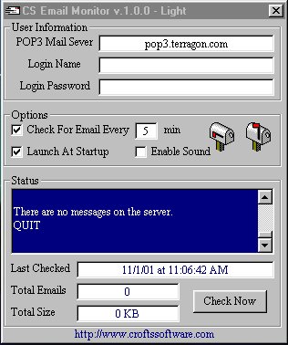 This will check a pop3 email account for any email. It runs in the systray and all settings can be saved. This is pretty handy at times. See Pic. Not much to this the pro version will have a LOT more options.