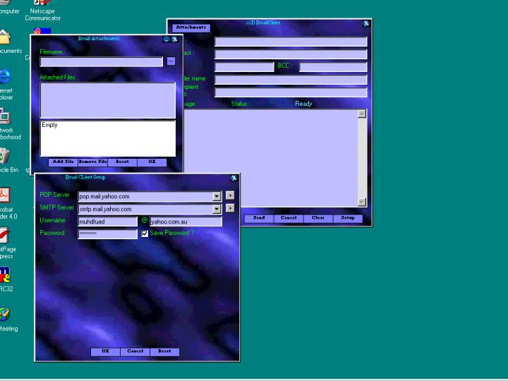 This is an email client that use the Simple Mail Transfer Protocol.Can be used with many SMTP servers ( Haven't found any server that didn't works well yet ).Able to include attachments with Email.Can authenticate with POP server first.Use MS WInsock Control TCP/IP connection.