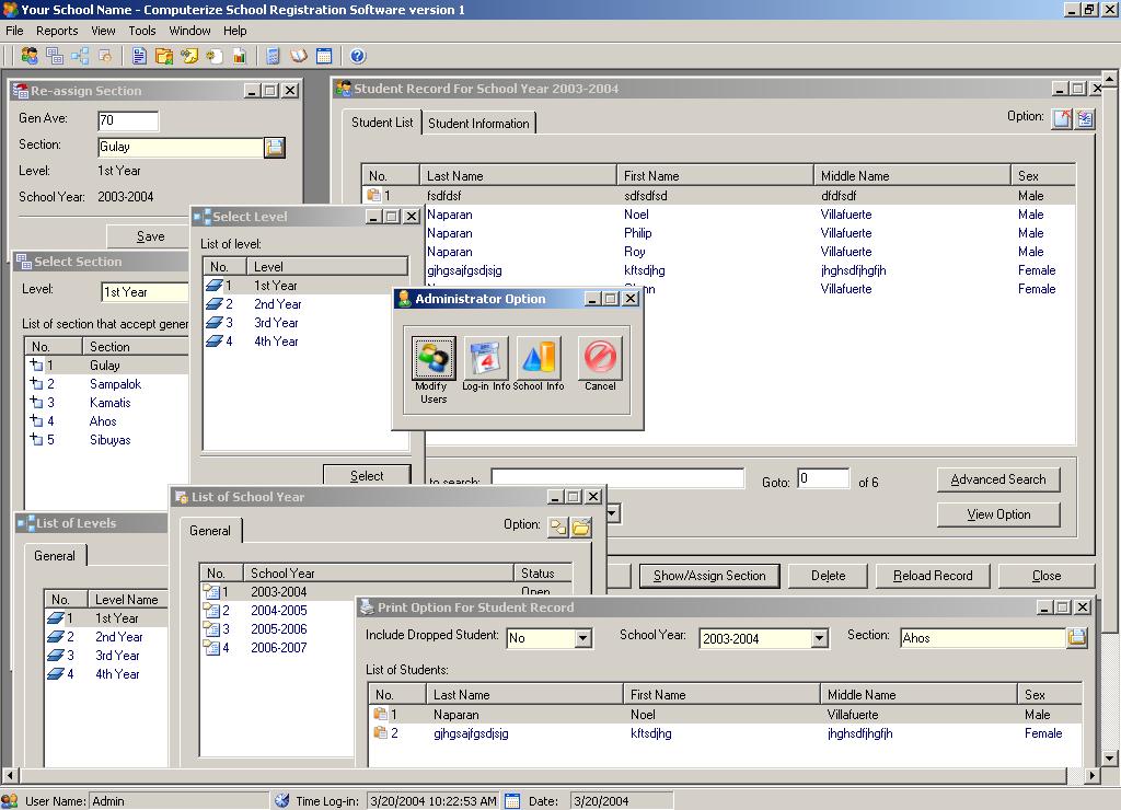 This is a complete Computerize School Registration Software which can be customize according to the name of the school. This software include record of users log-in and etc. The software also calculate how many student are curently enrolled and also update the allowed student per section every time you enrolled new student and it is similar to Inventory System ( download this to see more function ) . The application used ADO , String Manipulation , File System , Listview Control and etc ( see the include information for more ). For software like Accounting , Billing , POS ( Point Of Sales ), Account Recievable and etc. just log-on to www.naparansoft.cjb.net . This for all level of programmer . PLEASE DON'T FOR GET TO VOTE ! [ Philip V. Naparan ]