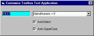 This all started when I noticed that I was constantly adding in code for when a textbox got focus, lost focus, etc. I decided that this would be a great chance to try my hand at making my own control. Fortunately, I spared VBC users the pain of some of the early versions of the control. I'm pretty happy with the latest version, so let me know what you think (and if you like it, vote for me! :-). Oh, I guess I should mention what it can do. It has several customized properties, such as "AutoSelect," which when True causes the text to be automatically selected when the box receives focus. Then there's "AutoUpperCase," which makes all entered text to be in upper case as it is typed. Then you've got "BackColor_Normal" and "BackColor_OnGotFocus." That's right, you can have it change to a different color when it receives focus (great for highlighting the current textbox when a user has a lot of fields to fill in). There's also "DefaultText" and "UseDefaultText." These are for having the text in the textbox revert to the default text after escape is pressed twice (the first esc is like an undo when you've started typing over something in the box). The latest feature is "TextType," which causes the textbox to only accept certain keystrokes, depending upon the property value. For example, there's AlphaNumeric, which allows everything, and then there's one for allowing only positive integers, and one for negative integers, pos/neg reals, alpha only, etc. This isn't like normal validation which checks the text after it's entered. This checks each keystroke and throws out the ones that aren't to be accepted. To run the tester .exe you'll need to register the cTextBox.ocx, or you can open the cTextbox.vbg file and run it from there. Let me know if you have any comments/suggestions/bug reports. Thanks! (and don't forget to vote :-) Oh! I just remembered, there's another property (two actually), "EntryTimerEnabled" and "MaxEntryTime." These are used to keep track of how much time it takes for a user to enter text in the textbox. If the maxentrytime is exceeded then the "EntryTimedOut" event is fired. This was added because my company often wants users to login to shop floor systems by scanning there badge ID and we needed to prevent the user from typing in an ID. Since barcode readers (or whatever type of scan device you use) are generally faster at generating characters than most typists, you can prevent typing in an ID by experimenting with the MaxEntryTime value.