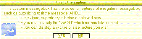 A custom message box with 6 differents "skins" (GlassRed, GlassCandy, GlassOrange, Glassblue, GlassWhite, GlassYellow) use any (or none) icon/bmp for the messagebox..any size you wish, an offsetX and offsetY for exact placement of your messagebox picture, and the ability to play either exclamation, or warning sound, or a custom sound of your choice(or no sound at all) and best of all..it looks real nice)