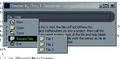 this took a little while to do, but the screenshot dosn't do it justice, i spent about 2 days on this and it is awsome, it will look exactly like an icq pop-up menu(if you right-click the description on the form you can see it), and it is also an easy way to add icons to menus, and to change the background and forecolor and highlight background/forecolors, this looks great and will be a part of my next app(GroupCode, which will be followed by AllCode - these two programs will have an opc client/server connection and i gaurantee you, they WILL change the way you program),i know that when a menu pops up it makes the parent form lose focus, if you have a way to fix this please help me and will post the updated code on VBC and give you credit for the fix, please leave comments/bug reports/bug fixes/and votes