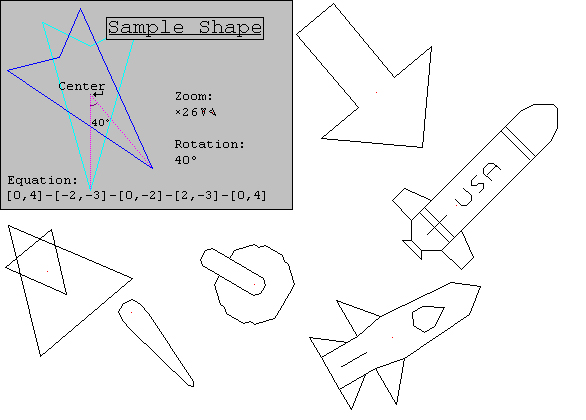 Allows the user to create shapes supported by a programming script, which are easy to rotate and zoom into. In the screen shot, you will see one such shape and it's formula. In this screen shot, I chose to display a boring graphic, and if you download this, you will see that surely great projects could be made with this code. I have programmed shapes for arrows, and gauges, airplanes, and a nuclear missile with the name "USA" on top. And they are all non-flicker graphics, easily rotated, and extremely quick.