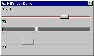 It always bothered me that Microsoft didn't make their boring Slider control with more options. This control allows you to customize the appearance of the gripper. It also, like the Winamp Slider control, allows the background to shift color intensities as you get closer to your miniumum or maximum values. Enjoy!