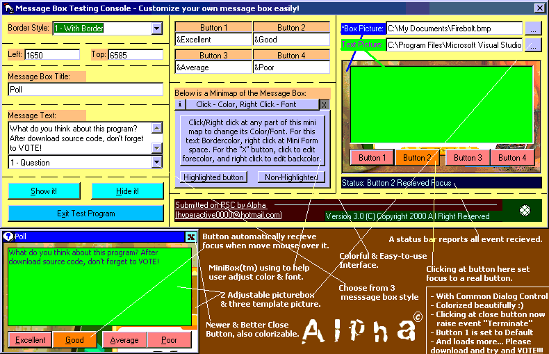 This UserControl Generate a Message Box that you can customize every detail of it. This is a 3rd update! Increase customizing performance, so you can adjust its... Title Bar Color & Font, Message Text Color & Font, Title Caption, Message Text, 4 Buttons Text, Button Highlight & Lowlight Color, Close Button Color & Back Color, Icon Back Color, Border Color, Border Style, Message Box Back Picture, Text Area Picture, and Message Box Back Color. Button now automatically recieve focus if you move your mouse over them, and the highlight color will be set to that button. Button also invisible if you don't set any caption data into it. If you think the desing is ugly can download it and customize yourself. In this version you also can insert picture in Message Box, and also another one as a background at text area. The screen shot is uglier that its real picture because this's .gif image. License problem is fixed so you shouldn't have problem with Regsve32 anymore. Old ugly close button now replaced with a better one. Please VOTE for me and leave comments. Good, bad, are strongly appreciate. Anyone who want to develop this with me just send an e-mail to [email protected] . Note: if you know how to play windows sound (set by user) like when you click Start menu or Minimize program, please tell me so I can put it in this code. Anyway, in this version, if you launch a message box, it also generate "Beep" Sound. Console Panel now very cool and so colorful, but you won't see it in screenshot. Now have method "SetBtnFocus" so you can set highlight to any button. 3 screen picture are add as template picture to put it in message box. Every time button recieve focus it generate event seperately. Console now have status bar to inform when any event has been raised. All properties is run-time customizable. Was it buggy? well, not in this version (3.2 R17) anymore.