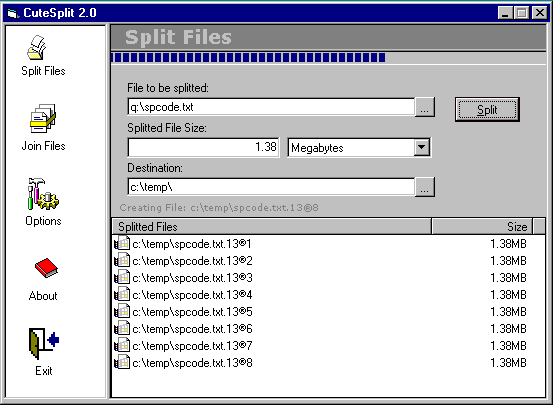 CuteSplit is very easy to use. Browse for a file and select from several popular split sizes to begin the process. To join splitted files just locate the first splitted file.