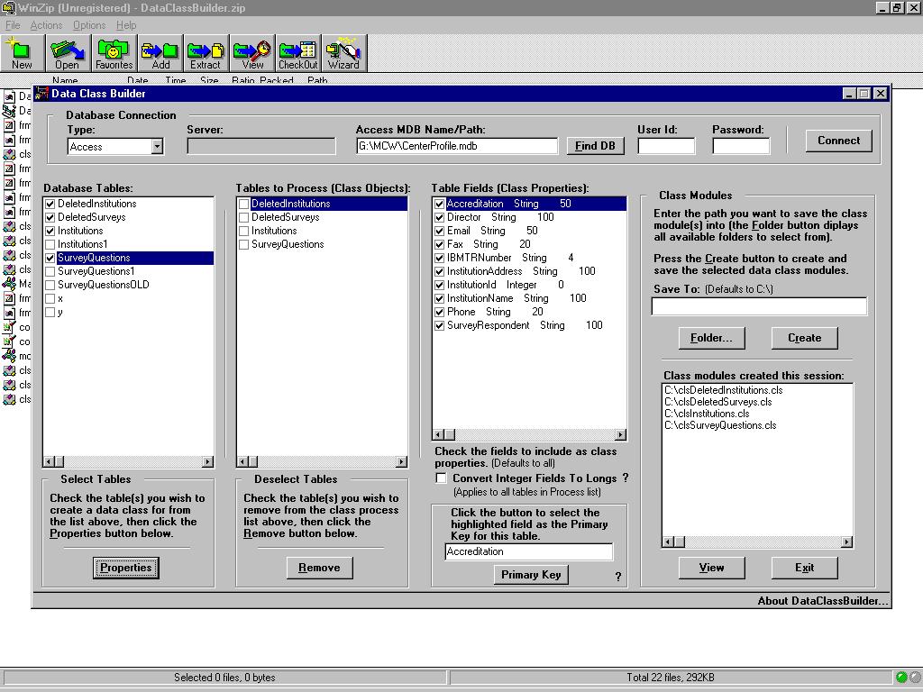 DataClassBuilder will query a database you are connected to and allow you to create a class file for each table you select. The class will contain all user-selected fields from a table and create them as class properties along with code for selects (single record), inserts, updates and deletes. It will use the primary key in the various SQL statements created (if the table does not contain a primary key, the program will make its best guess with the fields available and choose one – you can also manually select one). After you create the class you can view it in notepad (via the app). You can then use the class in you Visual Basic application. Currently, the classes are meant to be used with my clsDataAccess class file that comes along with the project. The connection code can easily be replaced if you use your own data access mechanism. I have built classes from Oracle 8.x, Access 97 & 2000, SQL Server, and Sybase 12 (you will need to change the Sybase Connection string to access a Sybase 11 or under database). It has been used at work but has never been fully banged on and I'm sure you may find places where it can be improved (including the too busy-looking GUI). And to be quite honest, I find myself going away from data class objects and collections in preference to Typed arrays (performance is much better).