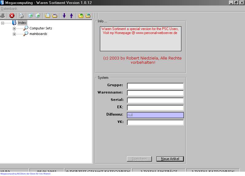 Megacomputing - Waren Sortiment, enables yor Store your Sortiment, Computers Hardware etc in a database, with price EK _german buy price , and Sell price VK