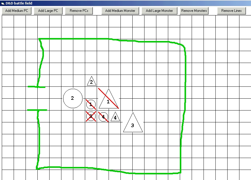 My DM wanted a small program to simulate a battle field and display it on his big screen TV when we play. The form is about 1024x768 because his video card is able to display at that resolution on a TV. Players are represented by circles and monsters by triangles. Each players and monsters have a number to make it easy to track them. You can drag the characters where you want. Right-clicking a character toggles between healthy, wounded and dead. Left-clicking and draging on the grid allows you to draw (wall, obstacles, etc). Right-clicking on the grid is the eraser tool. I only implemented medium and large characters because other sizes are rare.