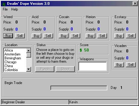 This is a game where you deal drugs to make money. You have to get $8000 in 50 days. It has 6 different drugs and uses alot of randomization.