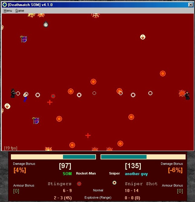 But the best part is, this code is *highly customisable*. You can add new weapons, new powerups, and new classes without having to change any code at all! You can quite easily make your own game by drawing your own pictures, recording your own sounds, and making your own settings file. You can even change the skins of the players: just draw your character, name the bmp files appropriately, and select 'Change Skins' from the menu. There's even a half-completed help file to get you started with the game (I haven't linked it to the program though. Sorry.)