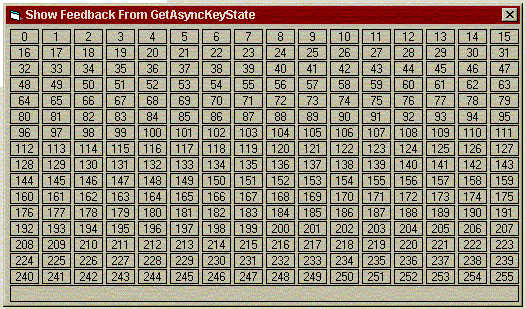 Nothing pushing the limits of VB, but when developing games/apps and using GetAsyncKeyState, do you ever go, "Uhmm, what the hell is left arrow again?!". here you are. run this app, press the key (or combo) and there it is! I think this is more of a useful tool than a coding extravaganza, so please vote/comment accordingly. You never know, while you're writing your 1st class game, you may even use this tool! :-)