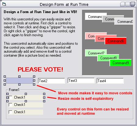 With this usercontrol you can easily resize and move controls at runtime. First click a control to select it. Then click and drag a "gripper" to resize. Or right click a "gripper" to move the control, right click again to finish moving.