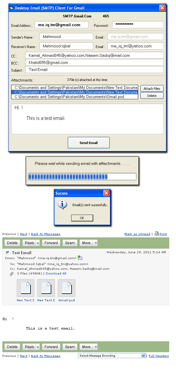 On some requests when origional project uploaded on VBC with the name of 'Urdu Desktop (SMTP) Email Client for Gmail', Some users requested to get the english version of the same project then it is converted by me to english & being uploaded on vbcoders.com. There is a desktop email client to send email using gmail address via MS CDO . No need to go on Gmail's website & login to send emails. Simply put you Gmail address & Password & send email with the (n) number of atachments. No size limit to attach files with email. All files with large size will be easily sent by this desktop client. CC & BCC function also support you to send emails with large attachments, to (n) number of receivers. Gmail's SMTP address & port fixed in this client. Keep in mind that this email client only designed to work with Gmail. No other email service provider checked with this email client and that may take errors, if you try to do that. This project may need more attention but at the start, i think it is enough to use. Please give feedback & suggestions to make this project more useful. Thank You.
