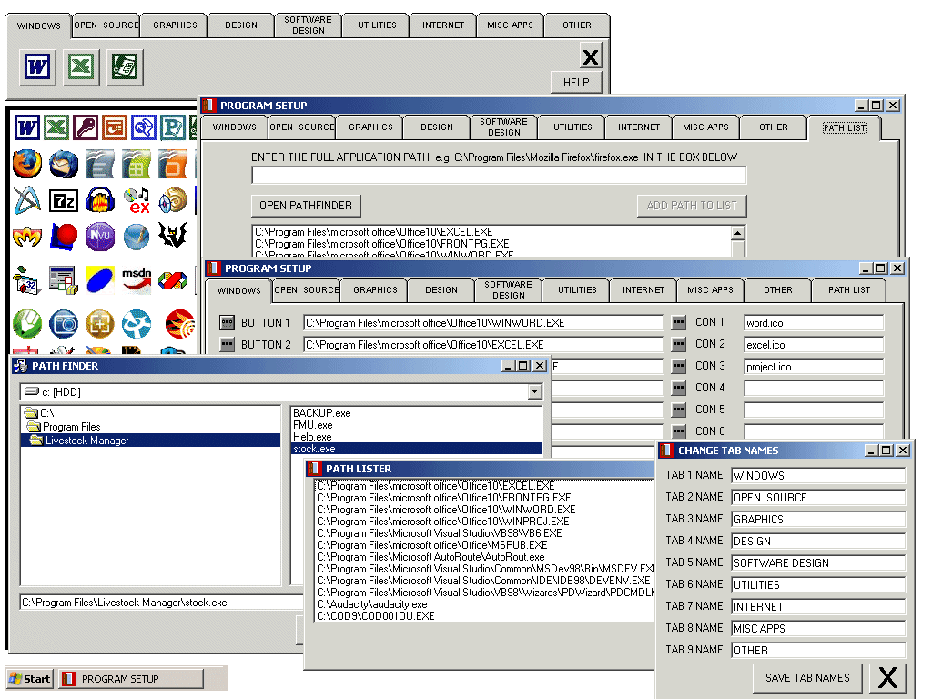 The organiser is fully customisable , Tabs, Icons and Program locations being user chosen. Capable of launching upto 108 programs from 9 Tabs and being changed any time you the user chooses.