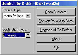 This is another program I wrote for Diablo 2. It converts any mana or health potion to a gem of your choice. It can also upgrade gems to perfect. This is only a start. The method used can be applied to other cheats.