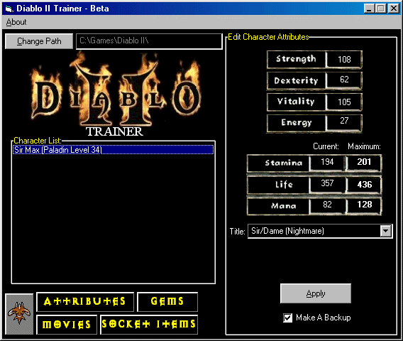 This program can change character's attributes, socket items, convert potions to gems, upgrade gems, enable movies, change character's title and has a kewl interface .. check it out!