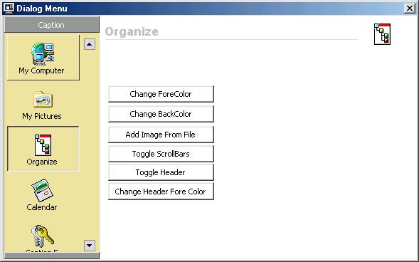 Update of the Usercontrol that emulates the menubar on the side of dialogs on system using the newest version of comctl32.ocx (I think). vbaccelerator image list is now built right in through a class, so there is no need to distribute his ocx (Steve mcMahon). Header and scrolling have been added to allow for a light emulation of an outlook menubar (only one bar though). Allows changing of backcolor, forecolor(text), Header Forecolor, Header Caption, and toggling of Scrollbar and Header Visibility. Also allows for images to be loaded from file and from a STDPicture object. If you are wondering why I went to such lengths to include the vbaccelerator image list in a class wrapper?? it supports color depths up to 32 bit, try that with the normal MS image list!!. All in all a nice control with a pretty small footprint.