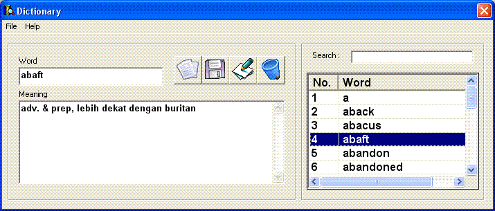 Dictionary refference by KAMUS DWIBAHASA Oxford Fajar. User can add,update, delete and search a record.