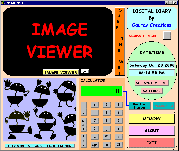 Here it comes again with a cool interface a compact one(like the msoffice taskbar) and a full one(see screenshot).It has more number of functions than you can imagine.An image viewer(not a simple one).A database using Msaccess.A calculator.A Phone Dialer.An Inbuilt internet browser.Calender,time date(you can even set the system time).Play movies or MP3's as you work.It took me many days to complete.PLEASE VOTE FOR IT.visit www.gauravcreations.com for many more cool programs .