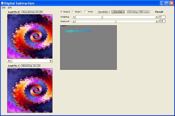 Digital Image Subtraction by Robert Rayment. (Updated: faster Basic routine, ASM action on Weighting & GreyLevel scrollbars) Demonstrates the power of MMX machine code which is at least 10 times faster than Basic in an optimally compiled EXE. See Info for limitations. Sample BMPs. Assumes MMX & QueryPerform.. APIs. Zip 123 KB.