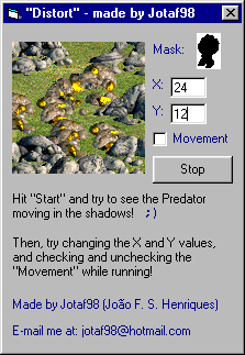 This function basically mixes all the pixels in an area of an image, defined by a mask image. The result is much like the invisibility effect used in the movie "The Predator", very cool if you want a small, quick function for that effect in your games! (It looks like the Predator is made of water or something)