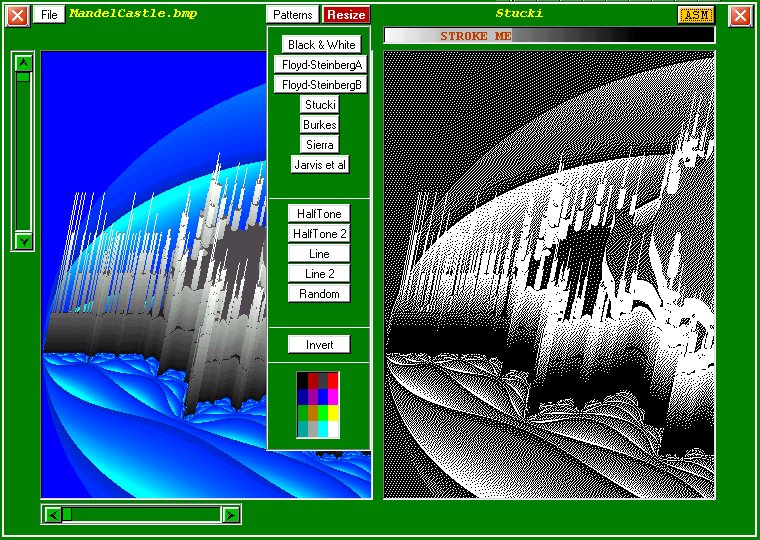 Dither by Robert Rayment. (Updated 26/11/02 Jump table used in ASM, 2-color saving corrected, improved scroll bars) This produces a 2-color bitmap from any original using a variety of methods and can be saved or printed. The program can be run in VB or VB+ASM. The structure of the asm file roughly follows that of the VB code and so should be useful for those new to assembler. The asm code is in a bin file but could be stored in a res file or made into a dll or a class (see buggy). See Notes.txt for more info. Zip 59KB, Win98 & exe tested on WinXP.