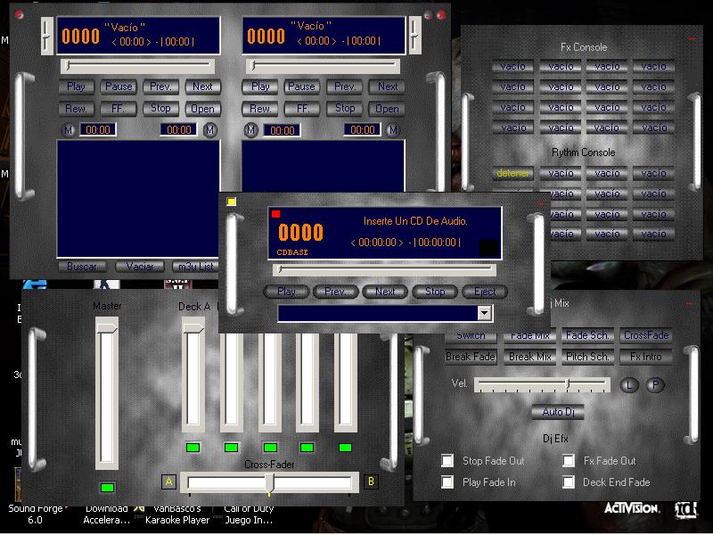 This is a proyect i been working on so many months. As you can see in the picture it's a complete DJ software to mix your mp3 in party's. Well what can i say, it has lots of modules i've recopilated from this page. Incorporates m3u and pls lists, id3 tags, fx and rythm mix, predifined mixes, skins, also cd control module, cutting for intros, fade out, and an experimental lights module for use with printer port.
