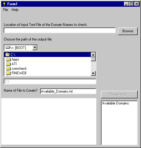 This is a GREAT Utility to find a domain name. You can feed it a dictionary and it will tell you what names are available! Simply select a txt file which contains words seperated by spaces and let it find the available .com's! Any feedback would be great! Uses Microsoft Internet Controls and HTML Object Library.