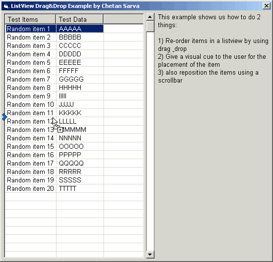 Shows how to re-order items in a listview by dragging and dropping them in their new position. Also shows how to give the user a nice visual cue for the new position. Items can also be re-ordered using the scrollbar.
