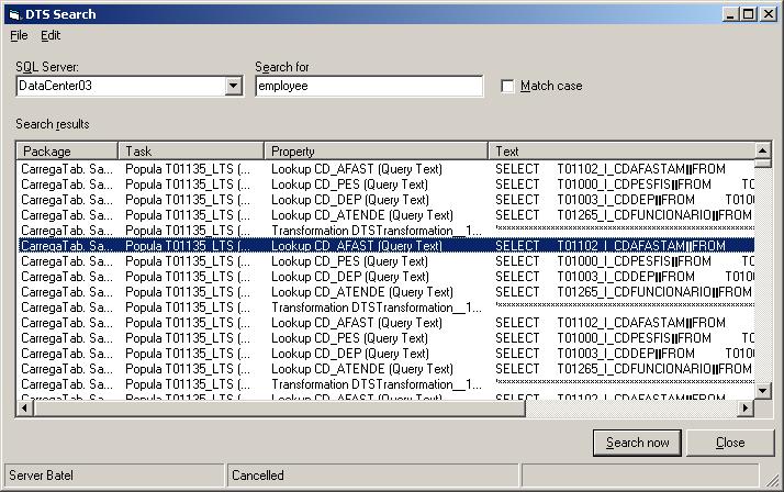 Search strings in DTS (Data Transformation Services) in SQL SErver. Microsoft don't provide such tool. Allows, for instance, find what task/package contains certain table or field. Accepts a table name, field name or any text and returns the packages/tasks where the text is. This code is usefull when you have lots of DTS packages that perform changes on tables that exist in the various database. Where is that table ??? Find with this tool. Uses SQlDMO.
