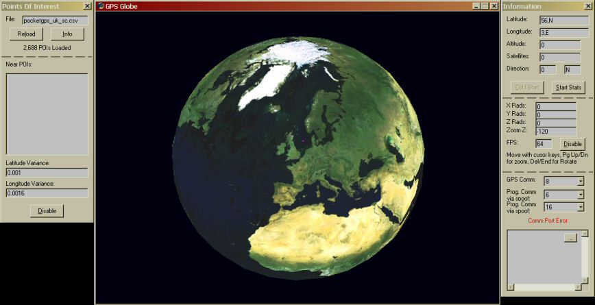 This views the a rotatable earth, if you connect a GPS it will show you the rough position on the globe with a pink square, but when you get on the other side of the planet the accurancy goes down by a dozen miles :( . You can load in a CSV file to inform you if your near a Long/Lat point..... It can record your movents and saves it in another csv file, so you view it on another program attached. I was planning to view the satellites it locks onto and make the earth more detailed when you zoom in on particular points. If I do - I'll upload it another time. This is a bit like a google earth clone.