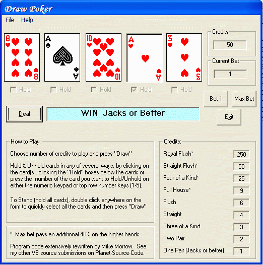 Play Draw Poker. Built on a base by noi_max, heavily modified in all operational aspects. This update puts in a pre-dealer which selects 10 cards and uses them to deal no matter when you hit Deal the second time. I had a totally random dealer which would deal different cards depending on when you hit deal. Look for how you can preview the second 5 cards (pronounced cheat).