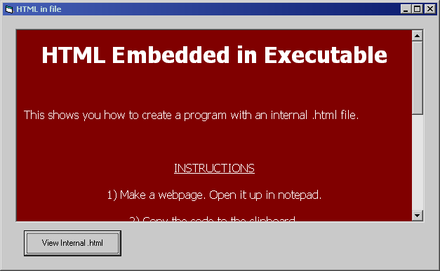 Really easy code and simple way of using an embedded .html file in a .exe. The code for the .html is stored in multiple strings, which are loaded and combined, then saved to a temp folder. Then the webbrowser opens the temp file for viewing. When program unloads the temp file is deleted. Please vote if you like it! Thanks.