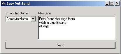 This App gives a nice GUI interface with added functionality to the traditional "net send computername message" command line. it uses windows API calls to send the message, additionally it will store previously used usernames to a file for easy access next time you open the program. It will reside in the system tray.