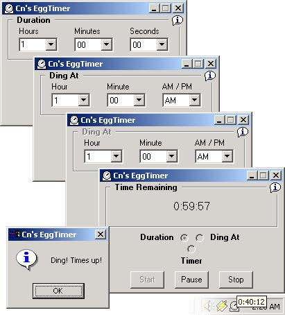 I was sitting at my computer today in a programming quandary when my fiancé asked me to let her know when it was 1:15pm. Since she does this quite often and I needed a distraction from my current task, I decided to build this little application – EggTimer. EggTimer allows you to set a duration (i.e. - 30min), a specific time (i.e. - 1:15pm) or it can be used as an upward counting timer (like a stopwatch). Once you start EggTimer, it minimizes itself into the system tray where it can be accessed to check the time remaining, reset/change the time, or pause/resume/stop the timer. You can also see the time remaining/running time by floating over the tray icon. When the timer expires, a ‘vbSystemModal’ message box is popped above your working app to let you know the time is up. This little application is really handy if you sometimes need a reminder of the time when you’re working on the computer =) This code utilizes a simple class I created from a number of examples from around the web that encapsulates the API functions used in placing an icon in the system tray. This class is definitely something to look it if you’re interested in placing an icon in the system tray. *LATEST UPDATE* It seems that I had a little issue with the time math in certain situations (it was adding an extra minute). When I get a chance I’m going to overhaul that little but complicated portion of the code. Enjoy, if you like it please remember to vote! If you find a bug, please let me know!