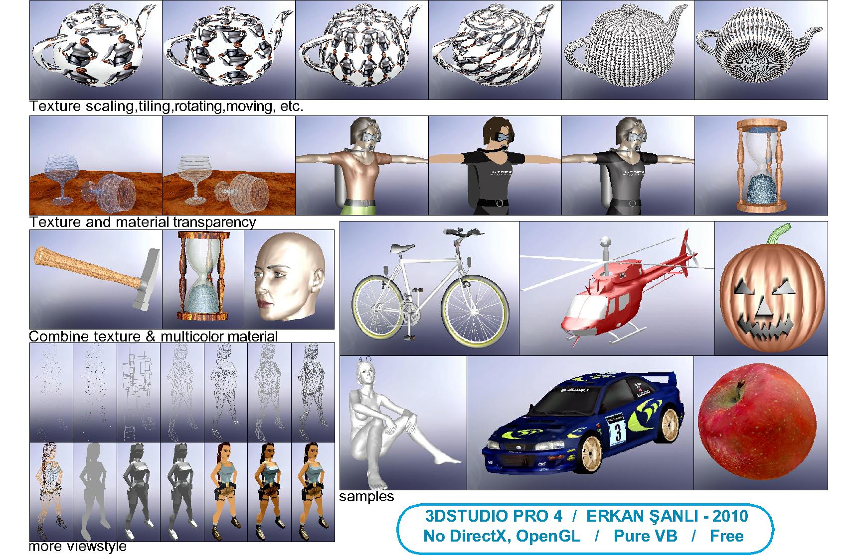 An excellent 3DS viewer application. This 3D application allows you to load 3DS files into the application and view them in 3D and save bitmap. Also editing texture parameters; change, tiling, moving, mirroring, flipping, rotating, change opacity-transparency value. Realtime changing material color using RGB and HSL on colordialog. Total 14 different viewstyle. New styles; texturized wireframe, transparent (hidden) wireframe, photo realistic.