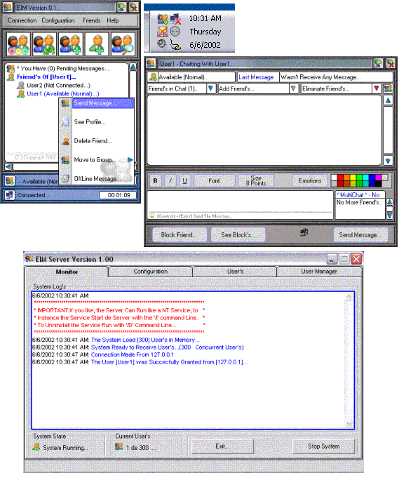 EIM is a Complete Messanger Aplication (Server and Client Part), like MS Messanger or Yahoo Messanger. - With a Very Nice Look and Fell -.