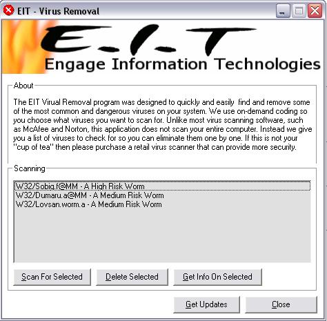 This is a simple application that is meant to scan for a few of the most harmful and annoying worms and viruses. The code is very beginner, because I don't really know how to code (good) yet. Just try it and if you don't like it then don't vote. But don't flame my code because atleast I try.