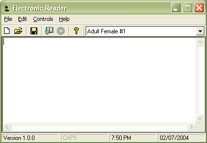 Well this be the best submission by me! It is a complete text to voice software using Agent control 2.0. It does not use any Microsoft characters. The 10 voice types availabe are designed by me using Agent Character Editor. It is well designed with a professional look. You must have Lernout & Hauspie(r)Truvoice TTS Engine - American English which can be downloaded for free from https://www.microsoft.com/msagent/downloads/user.asp#tts