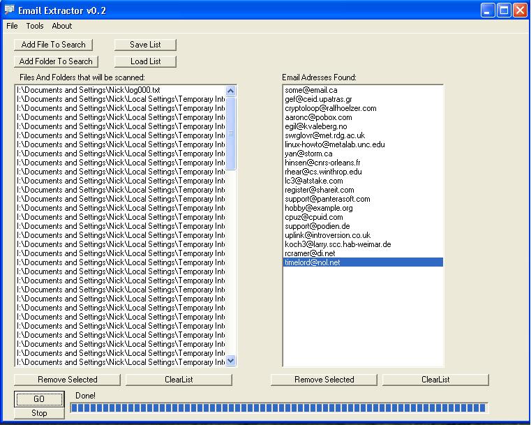 The program is an email extractor that sweeps either individual pages or entire directory for email adresses. It picks out and relevant file types which are customisable (txt,html,js etc.) also has many usefull options and feautures a nice error handler script.