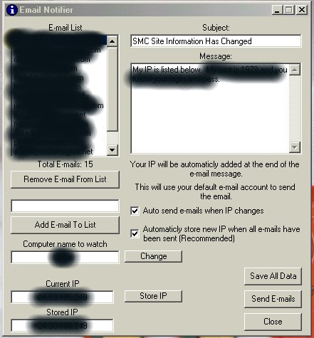 This is an application that monitors the local host for IP address changes and notifies a list of people by e-mail if the IP address changes. Both the IP address and the e-mail list are stored between sessions, so it will work, for instance, if the IP change is detected following a re-boot. The code also illustrates a number of useful techniques, such as how to send e-mail via MAPI and how to Winsock API to resolve the local IP address.