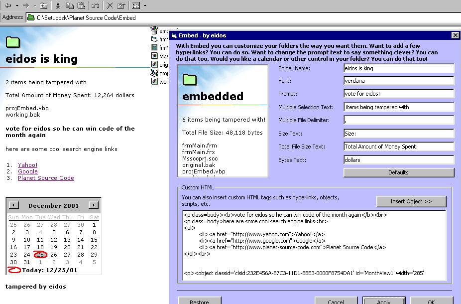 Look at the screenshot. With embed you can modify the windows folder look to suit your style. Do you want a few links in the window, do you want a calendar, how about a custom title for your folders. Maybe a custom font? It's up to you with Embed. You have to see the screenshot. Don't forget to vote! Make sure you have folders set to view as a web page!