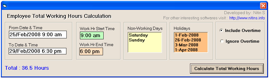 Calculate the exact Buisness/Working Hours of an Employee between two given dates. It can Include/Exclude Overtime hours. It also excludes Holidays and Saturday/Sunday during the calculation.
